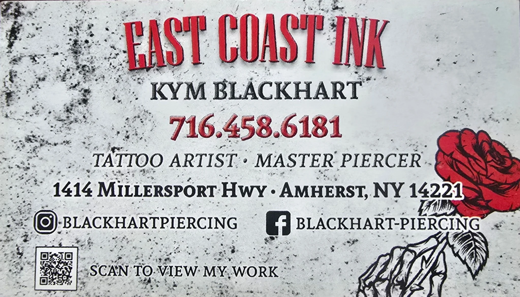Hi everyone! My name is Kym Blackhart, and I'm a professional body piercer and tattoo artist. I have been piercing for many many years, and I came aboard East Coast Ink in 2020. In Jan 2025, I started Blackhart Piercings, still operating out of East Coast Ink. I love the art form and history of piercings and tattoos, and it truly is my passion!